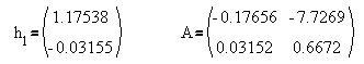 Переходные характеристики получаются при вычитании из данных Таб.1 значений переменных в установившемся режиме, существовавшем в системе до подачи возмущающего воздействия (т.е. значений переменных, стоящих в первой строке таблицы). По этим данным были определены коэффициенты матрицы A и столбца матрицы H, связанного с током нагрузки, - h1 (считаем что нулевой элемент ВВВ - напряжения питания, первый элемент - ток нагрузки), при значении смещения n=1: